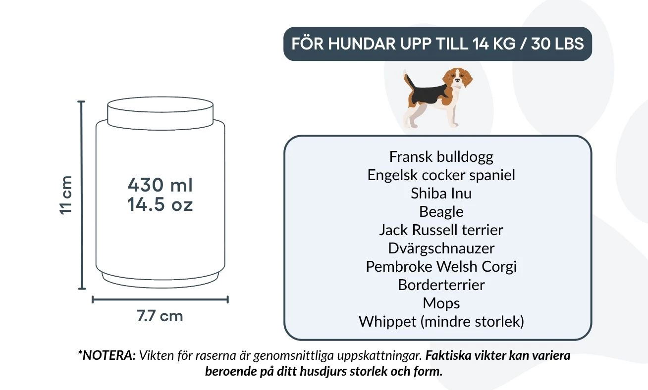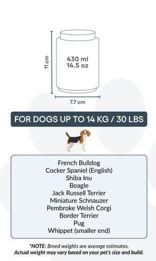 Tailles / Capacité de l’urne : Petite : 7,7 cm (L) × 11 cm (H) × 7,7 cm (P) | 430 ml / 14,5 oz Convient pour les chiens jusqu’à 14 kg / 30 lbs Races courantes : Cavalier King Charles Spaniel, Bouledogue Français, Shih Tzu, Border Terrier, Boston Terrier, Jack Russell Terrier
