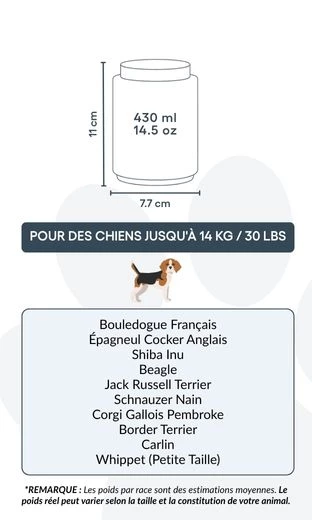 Remarque : les poids des races sont des estimations moyennes et peuvent varier selon la taille et la morphologie de votre animal.
