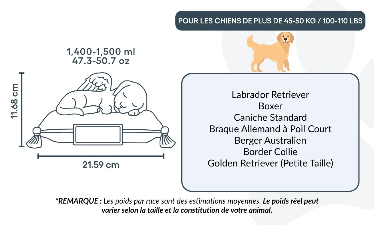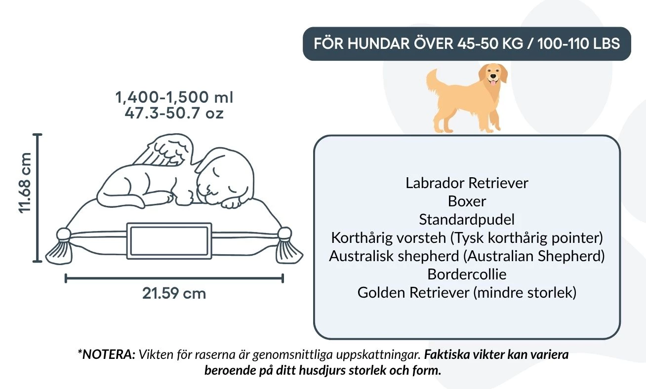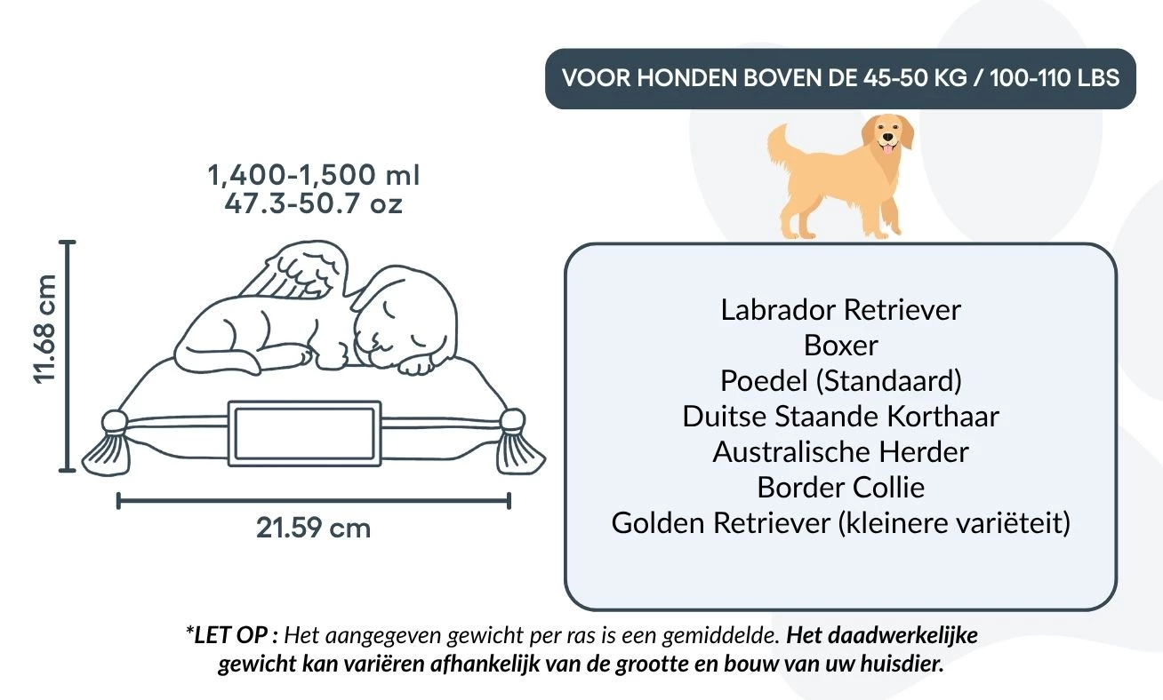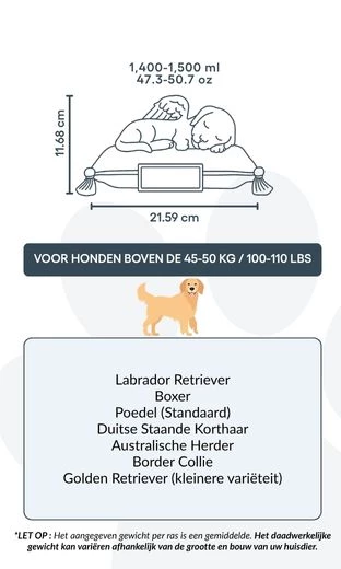 Let op: De inhoudsmaat is gebaseerd op gemiddelde crematiehoeveelheden. Houd rekening met het gewicht en de bouw van je huisdier bij het kiezen van een urn.
