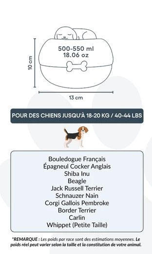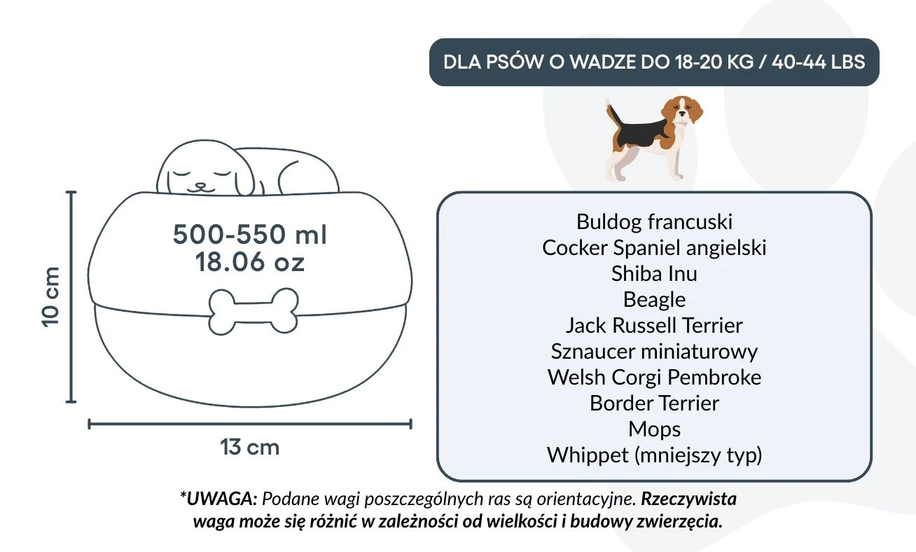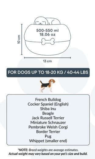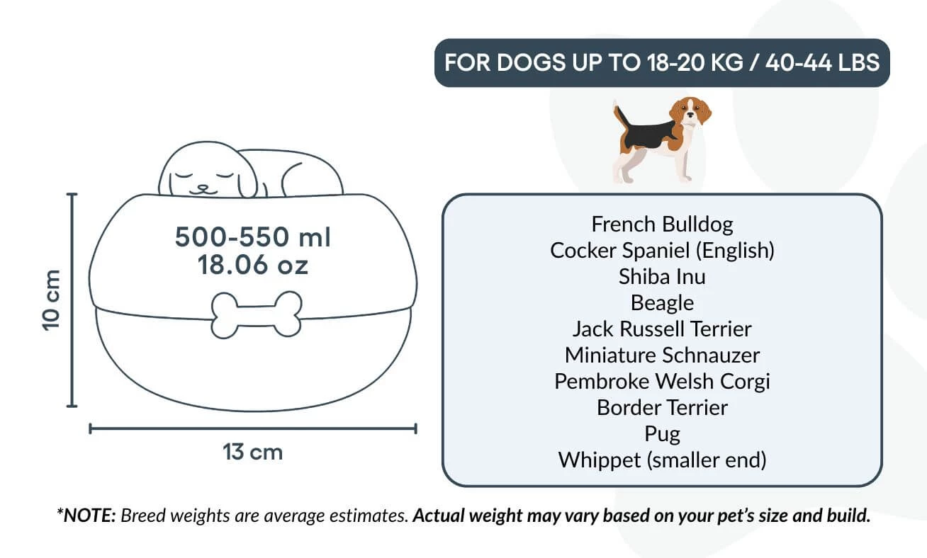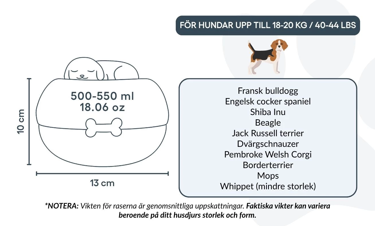 Afmeting / Inhoud urn: 13 (B) × 13 (L) × 10 cm (H) / 283 g | ~500–550 ml / 18,06 oz | geschikt voor honden tot 18–20 kg / 40–44 lbs