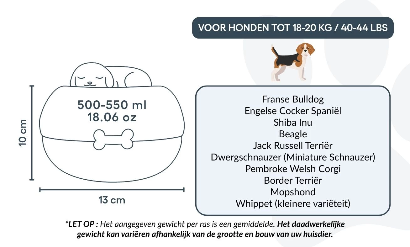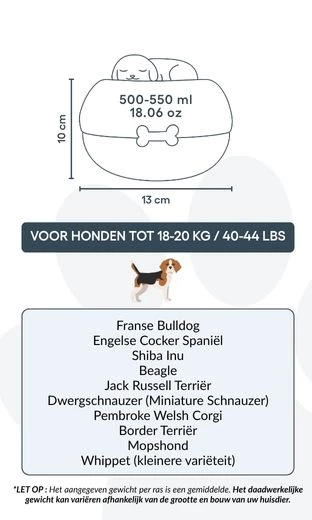 Veelvoorkomende rassen die passen: Beagle, Shiba Inu, Franse Bulldog, Boston Terriër, Dwergpoedel, Cavalier King Charles Spaniël, Basenji, Miniatuur Australian Shepherd, Cocker Spaniël, Welsh Terriër.