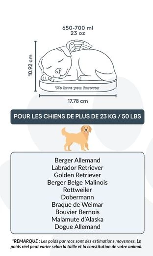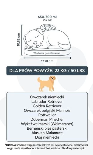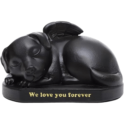 Vervaardigd uit duurzame, weerbestendige hars, toont deze gedetailleerde urn een vredig slapende engelhond – een symbool van eeuwige rust, bescherming en onvoorwaardelijke liefde. Het discrete binnencompartiment bewaart de as veilig en waardig, terwijl het ontwerp naadloos opgaat in een natuurlijke omgeving.