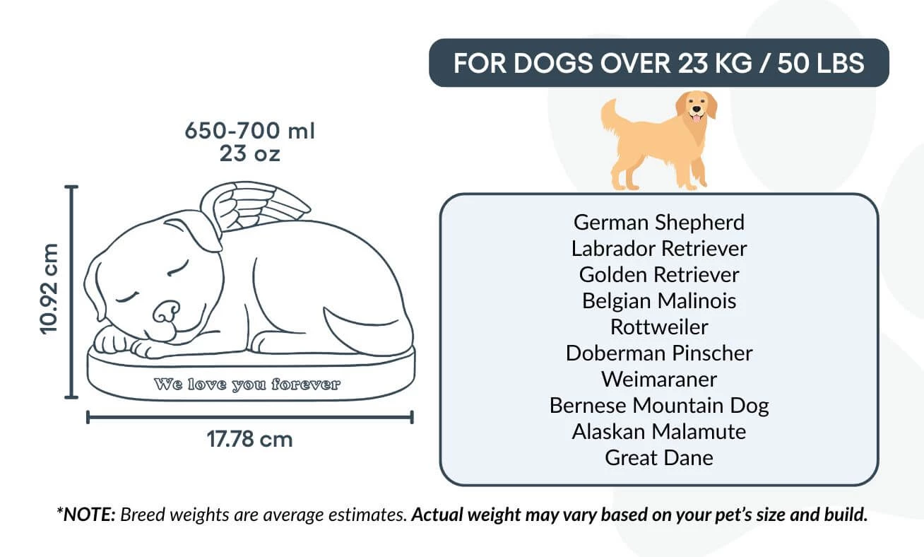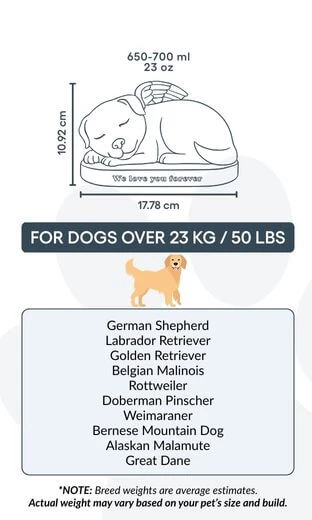 Let op: De inhoudsmaat is gebaseerd op gemiddelde crematiehoeveelheden. Houd rekening met het gewicht en de bouw van je huisdier bij het kiezen van een urn.