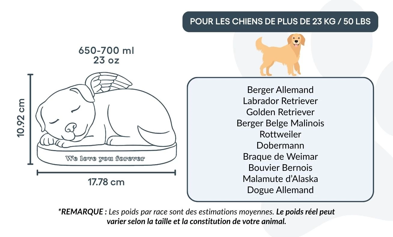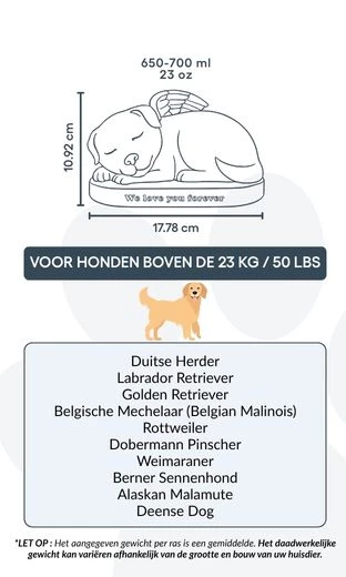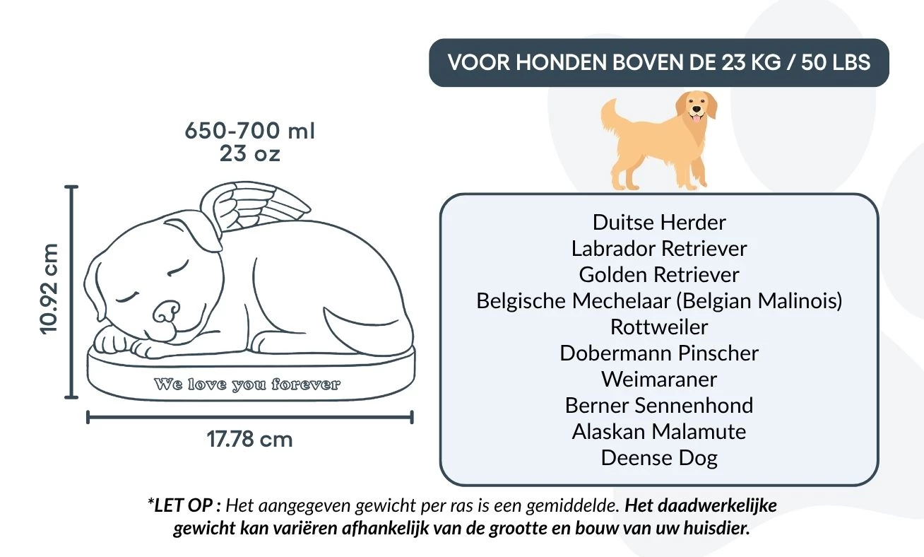 Of je deze urn nu plaatst bij een bloemenperk, onder een geliefde boom of bij een familiegraf, de Engelen Hondenurn biedt een troostrijke herinnering aan de liefde die altijd blijft voortleven.